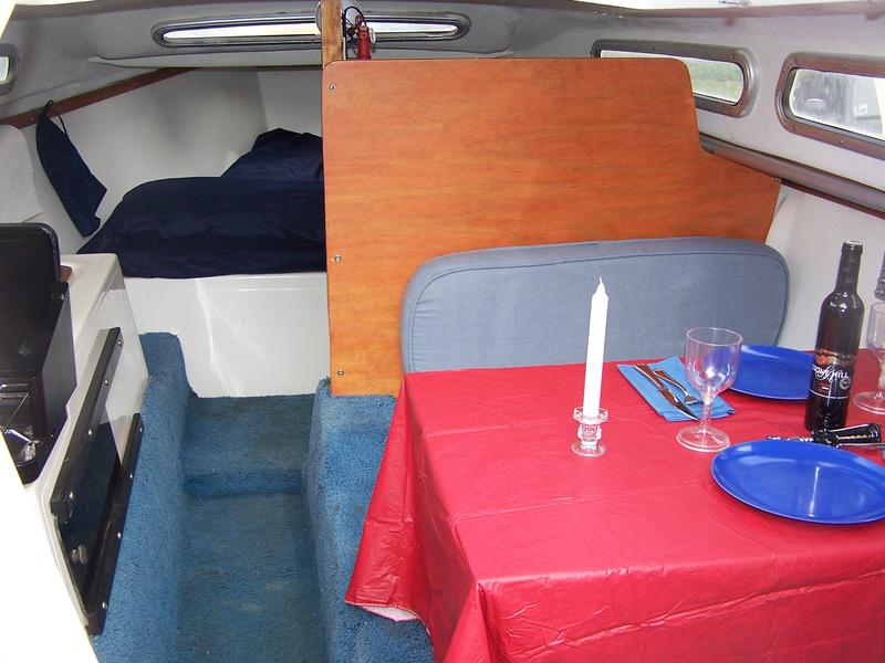 Interior white/red lights, new bow-mounted navigation lighting. AM/FM Stereo. Depth finder. Sleeps five in drop down table berth, Vee-berth and pilot berth. Two fire extinguishers, new life jackets, two 6 gal fuel tanks, life rings (2). Trailer tie down straps and other hardware. Cockpit cushions. Heel indicator (angle of heel). Wind direction indicator on mast. Interior flotation material in place in boat. Dock lines and fenders.