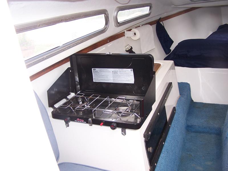 Galley has sink, ice box, hand pump water faucet, and 2 gallon fresh water tank and gray water tank below sink. (We normally carry a 5 gallon tank for refilling on weekend trips) Two burner propane stove, mounted in galley. I have the manual for the Macgregor 25.
