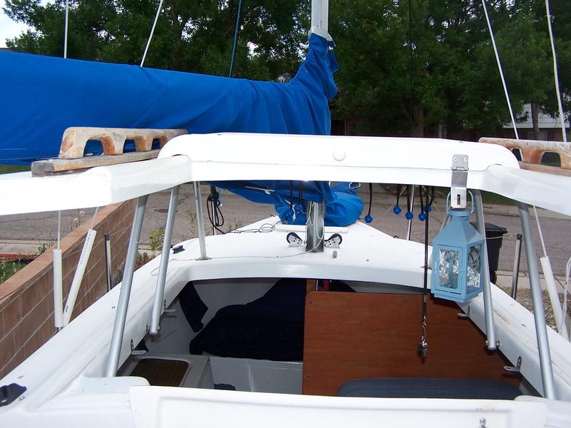 The interior wood has all been replaced. Blue bottom paint, red boot stripe. Standing rigging in excellent shape. Halyards and Jib sheets replaced in 2011 along with main sheet blocks. Bow mounted anchor bracket (for Danforth). Sails are older but work fine; Mainsail and working jib. Sail bag. Whisker pole. Boat hook. There is a gin pole and block and tackle to step the mast and I will teach new owner how to step mast and set up rigging. (It’s very easy to do.)